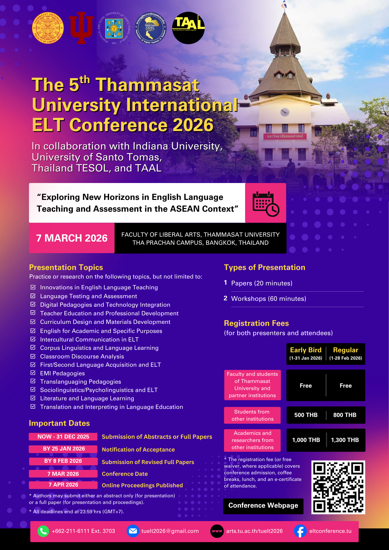 cordially invites academics, researchers, and practitioners to submit and present their work at the 5th Thammasat University International ELT Conference 2026, under the theme “Exploring New Horizons in English Language Teaching and Assessment in the ASEAN Context.”